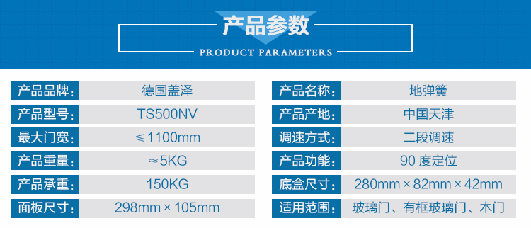 ?地弹簧TS 500NV适用于门扇宽度在1100mm以内的门,门的重量可以背负≤150kg的载荷