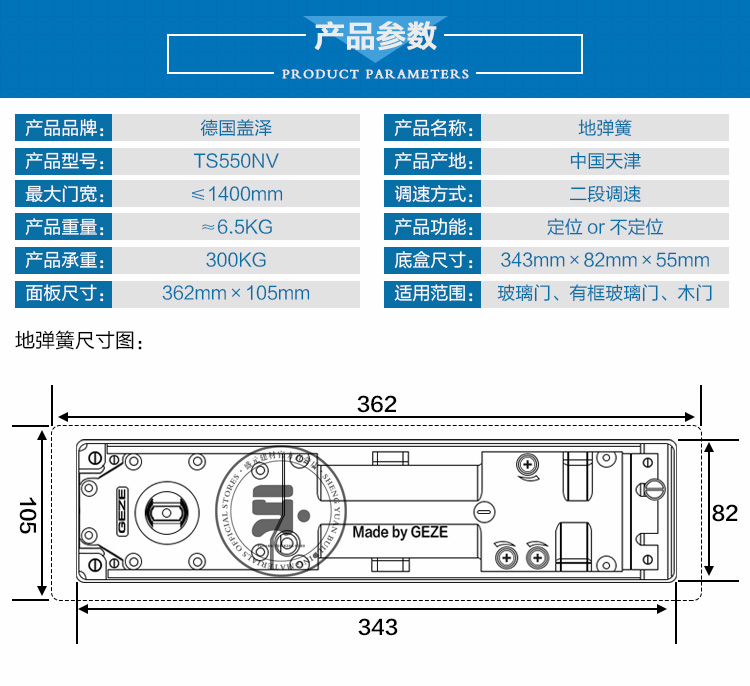 ?地弹簧TS 550NV适用于门扇宽度低于1400mm且门的重量可以≤300kg的门